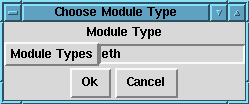 If there is more than one module which can be used for the module type you have chosen, you will be presented with a dialog box (Figure 3-38) which asks which module you want to use, and may also ask for specifics about the type of module; for ethernet, for example, you need to choose from eth0, eth1, etc. When you are done, click Ok again to continue to specify any module options in the next dialog box (Figure 3-38), which is the same as the dialog for editing a module.